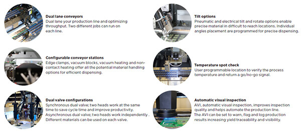 Precise temperature controls, on-the-fly fiducial search, robust vision algorithms, low motion Z axis and non-contact dispensing are some feautures to increase productivity.