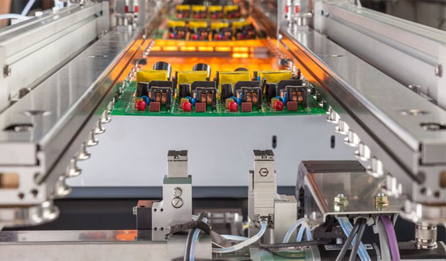 The aim of the preheating process is to homogeneously heat the PCB before it is transported to the soldering module. The aim here is to provide up to 50 percent of the heat energy via infrared bright emitters so that the PCB is not shock-heated when it comes into contact with the liquid solder.