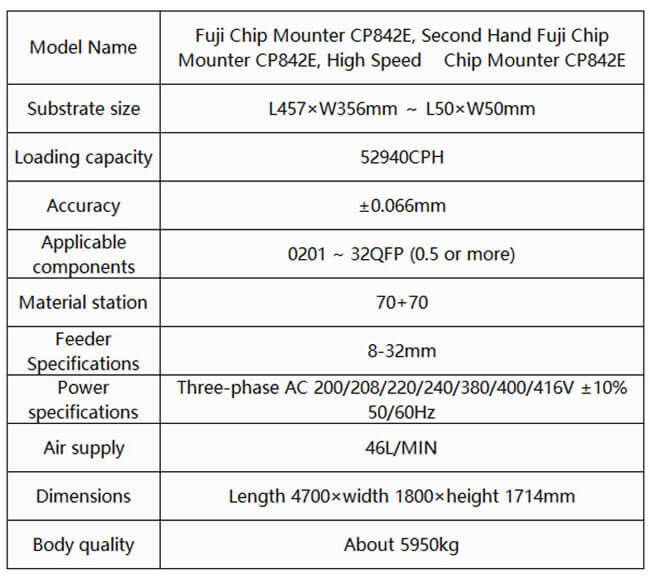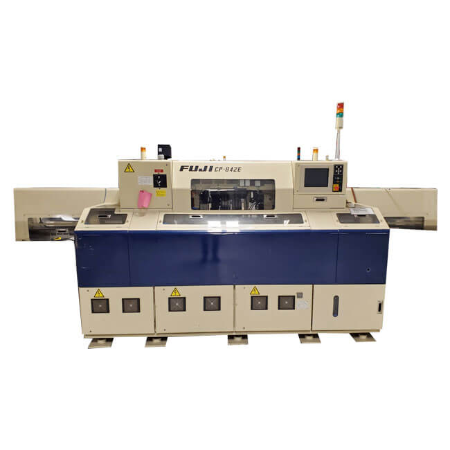 The Fuji CP-842 builds on the well tested and highly successful CP platform with further refinements and technological advances to create a turret-type, high-speed chip placer with stable throughput. A new index unit and improved pick-up offsets constantly maintain placing accuracy and enable fine pitch placement. The CP-842E can handle boards ranging from 50 mm x 50 mm to 457 mm x 356 mm with a max feeder capacity of 140 (100 for the CP-842ME). Placing parts as small as 0402(01005) with an accuracy of +/-55 µm, the CP-842 is a quality machine that can fit into any production environment.