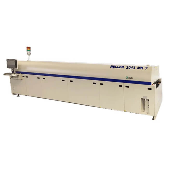 The 2043 MK7 reflow oven machine is an ultra-high volume reflow oven with 13 heated zones and belt speeds up to 1.88m/min. The 2043 offers the lowest delta T’s, reduced nitrogen and electrical consumption and advanced flux management options. The 12” wide heater modules offer profile compatibility with competitor systems.