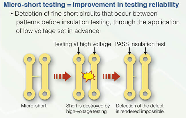 Use 4-terminal measurement to detect increases in wiring resistance caused by phenomena such as open vias, and use continuity testing at large currents of up to 200 mA to guarantee board integrity under conditions that approach actual operation.