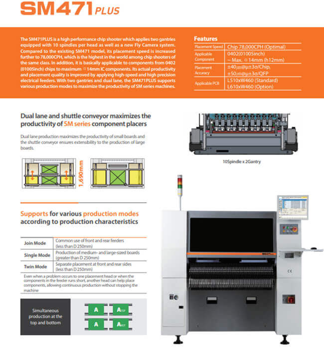 Compared to the existing SM471 model, its placement speed is increased further to 78,000CPH, which is the highest in the world among chip shooters of the same class. In addition, it is basically applicable to components from 0402 (01005inch) chips to maximum □14mm IC components. Its actual productivity and placement quality is improved by applying high-speed and high precision electrical feeders. With two gantries and dual lane, the SM471PLUS supports various production modes to maximize the productivity of SM series machines.