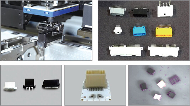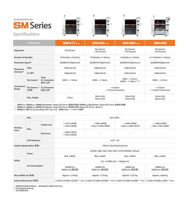 The SM485 is a wide range chip mounter that allows high-speed placement of small components as well as precise placement of odd-shaped components. With 4 sets of high-speed wide-use spindles and 1 set of precision spindle with back-light system and force control function, SM485 can place components from 0402 chips up to 55 (L150 x W25 x H26 mm) components.