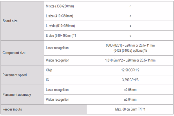 *2 Effective tact: The chip placement speed indicates an estimated value obtained when the machine places 400 1005-chips all over an M size board.