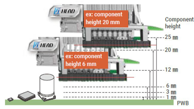 By positioning the laser sensor closer to the board and reducing travel time from pick-up to placement, the one-head mounter achieves an optimal speed of 50,000 CPH in its ideal conditions.