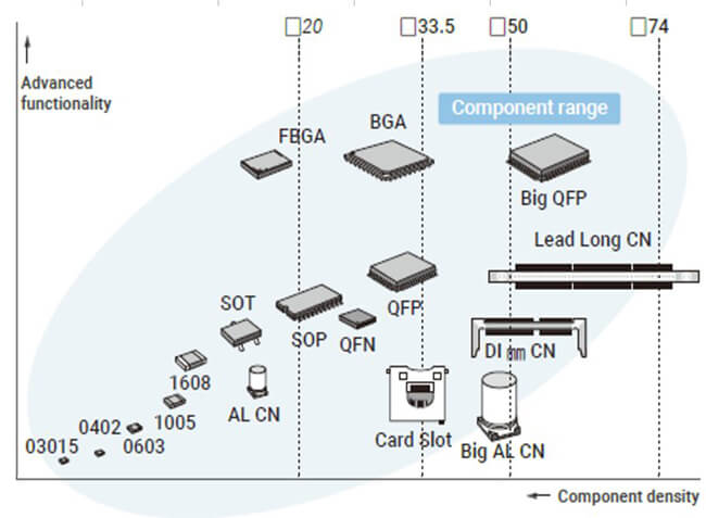 Supports components from sizes as small as 03015 up to 74 mm square or 50 mm x 150 mm, with placement heights accommodating components up to 25 mm.