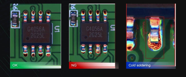 AI combined algorithm used to detect solder joints, copper exposure, cold soldering, and other defects. It is not affected by the difference in the shape and color of soldering due to solder paste brand, furnace temperature, and other conditions, and it has higher reliability.