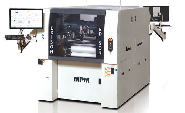 The Edison printer is the industries’ most accurate printer (certified by third party) with +/- 15μ @ 6σ wet print repeatability. Total throughput is lightning fast due in part to the highly-efficient, parallel processing of the stencil shuttle system, stencil wiping, paste dispensing and vision alignment system. The MPM Edison™ stencil printer is ideally suited for the growing Automotive, Semiconductor and Smart Device manufacturing markets.