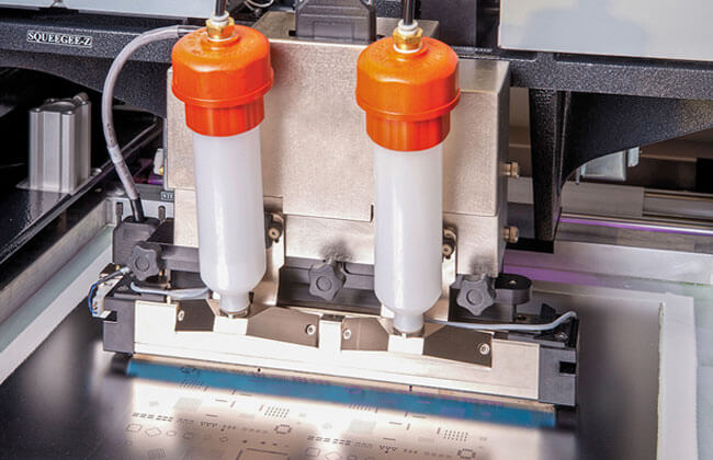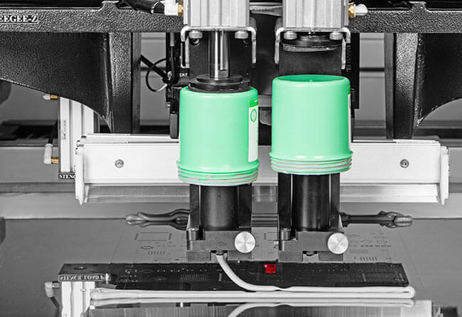 Dispense for standard cartridges or choose the new patent-pending jar dispenser. Paste is released in precise, measured amounts across the stencil in a clean, uniform bead. Deposition volumes, frequency and placement are user programmable.