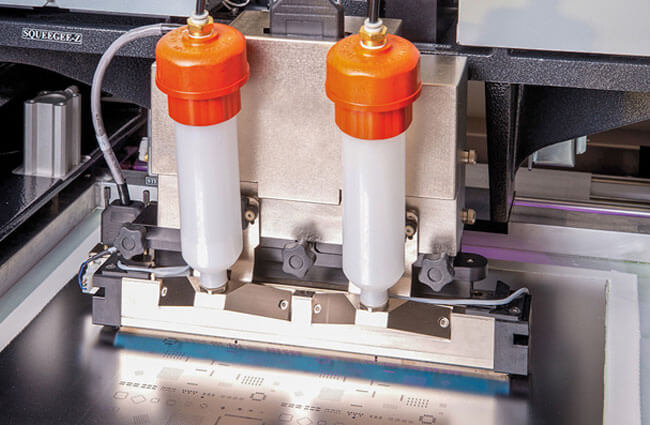 Dispense for standard cartridges or choose the new patent-pending jar dispenser. Paste is released in precise, measured amounts across the stencil in a clean, uniform bead. Deposition volumes, frequency and placement are user programmable.