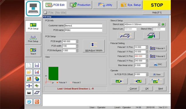 The Windows-based AP660 is easy to program, allowing the printer to be up and running quickly after install. All parameters, including print speed (programmable from 10 to 120 mm/s), stroke length, squeegee pressure, etc., are fully programmable via the graphical user interface. During operation, all details, including process status of the current job, are displayed on screen.