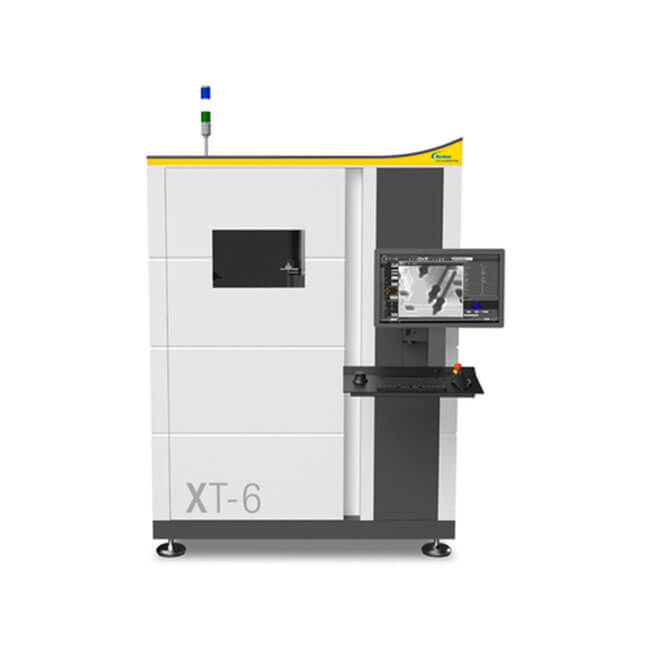The XT-series provides the advanced inspection capability of Nordson TEST & INSPECTION's inline system in a smaller footprint manual load/island of automation system. The platforms are designed for flexibility and ease of use for a wide variety of products requiring 2D and 2.5D automated X-ray inspection. The XT-6/XT-6A platform is a highly flexible automated X-ray inspection system with minimum footprint and a parallel-kinematic Hexaglide manipulation unit for extreme-angle off-axis image acquisition with high resolution. It is suitable for high-quality X-ray analysis of electronic assemblies and material analysis of parts that require flexible part manipulation with multiple inspection angles. For batch modes and volume inspection the XT-6 can be equipped with a single-sided conveyor setup and magazine load/unload station (XT-6A).