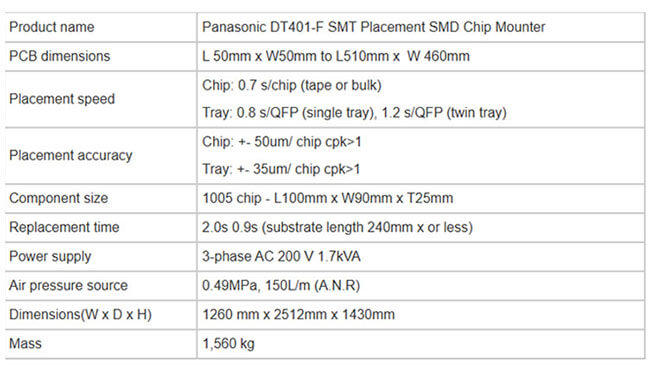 The Panasonic DT401 is a direct tray modular, multi-functional placement machine that's designed to give users the flexibility to place a large number of varied, odd-shaped components at high speeds. Direct placement head pickup allows for the wide component range, while tray feeder replenishment and a feeder collective-exchange cart delivers improved operation rates.
