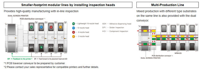 Panasonic NPM-D3 Electronic Production Modular is a new concept machine designed and manufactured by Panasonic according to electronic mounting changes. It integrated higher productivity and quality with printing, placement and inspection process. Configurable modules allow flexible line setup. Comprehensive control of electronics production lines, floor and factory with system software. It is the best choice for customers who require high production capacity, fast line transfer and wide variety of components.
