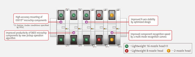 A maximum speed of 92,000 CPH is achieved by adopting the lightweight 16-nozzle head V3(For placement accuracy of ±37 μm)