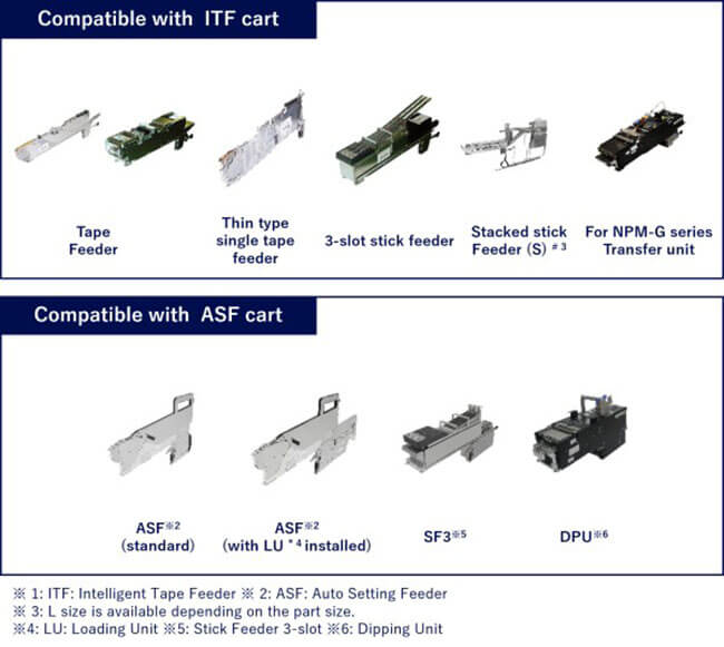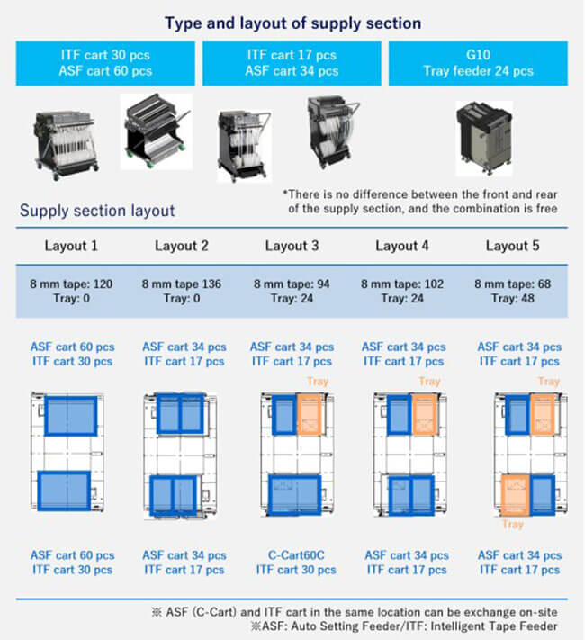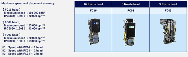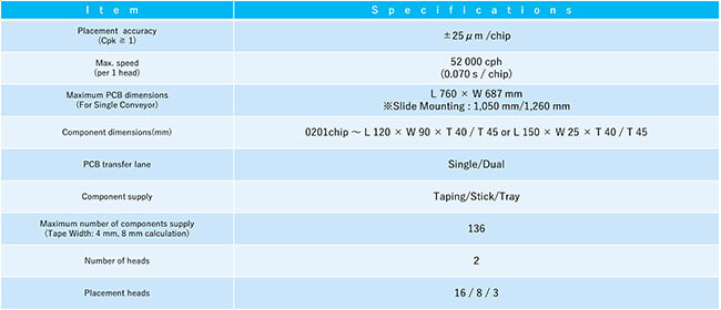 The basic performance of this modular mounter has been improved by renewing the core units, such as the placement head and recognition camera. It now supports a wide range of components and various components supply configurations, and can also handle larger PCBs. It also supports various automation and manpower-saving functions, including the Auto Setting Feeder (ASF), which automates the components supply operation, to flexibly meet the requirements of each mounting site.