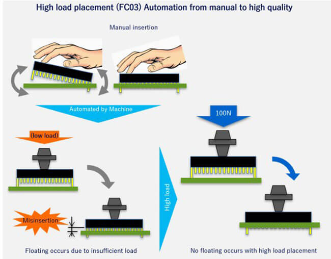 High load placement of 100N is able to eliminate pin floating, and tall component mounting up to 53mm (including PCB thickness) allows automated DIMM connector placement. (*Please consult us for applicable components.)