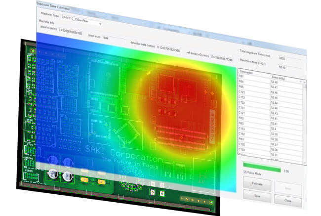 Saki’s X-ray inspection equipment is equipped with an exposure dose simulator, predicting the exposure dose for each area to optimize imaging conditions. X-rays are irradiated only during imaging, minimizing irradiation.