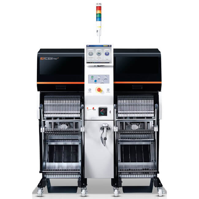 A high speed modular mounter using a high speed rotary head equipped with 16 nozzles. EXCEN has the world’s highest speed in the world among mounters of the same class as well as the world’s highest area productivity. In addition, it secures the reliability of fine chip placement by using the function to monitor pre- and post-part placement, SVS (Side-view Vision System), and maximizes work convenience and actual productivity by applying various operation modes including non-stop device type change,mixed production of different boards as well as the SMART Feeder that realizes the world’s first Auto Splicing and Auto Loading functions.