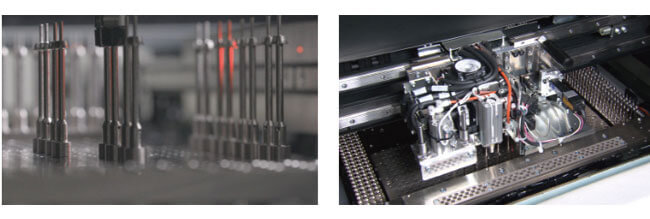 The function automatically replaces the push-up pins which support the PCB from below. Two gripper heads do high-speed replacements that not only slash setup/changeover times but also reduce human error. Even the large PCB such as 420x420mm can be supported by maximum of 200 pins with a margin. Pin layout can be set using mounter data and images captured by AOI, simplifying data creation.