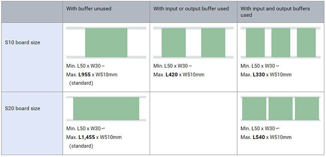 | Board size(with input and output buffers used) | Min. L50 x W30mm to Max. L330 x W510mm | Min. L50 x W30mm to Max. L540 x W510mm |