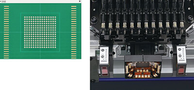 Dispense heads that can be exchanged with mount heads are newly developed. It becomes possible to make 3D placement where solder paste dispensing and component mounting can be alternately performed. Hybrid placement is now realized. The removable Dot Station can be fitted to the feeder bank.
