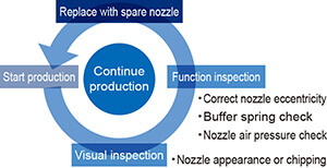 Self-diagnosis and self-recovery functions continuously maintain nozzles and feeders in a clean state for continuous high-quality production.