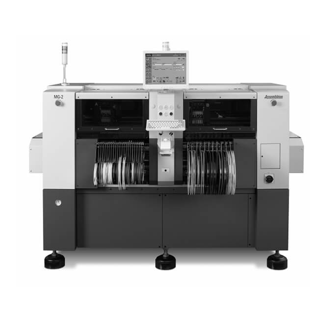 The MG-2 provides the ultimate in high-speed, high-mix, high-accuracy production for applications such as automotive, memory boards and PC peripherals. It can be used standalone to deliver chipshooting speeds up to 40k cph at lowest cost per placement. Or it can be used alongside the MG-1 and/or MG-8 multifunctional machines to boost line performance in applications requiring additional chipshooting capacity.