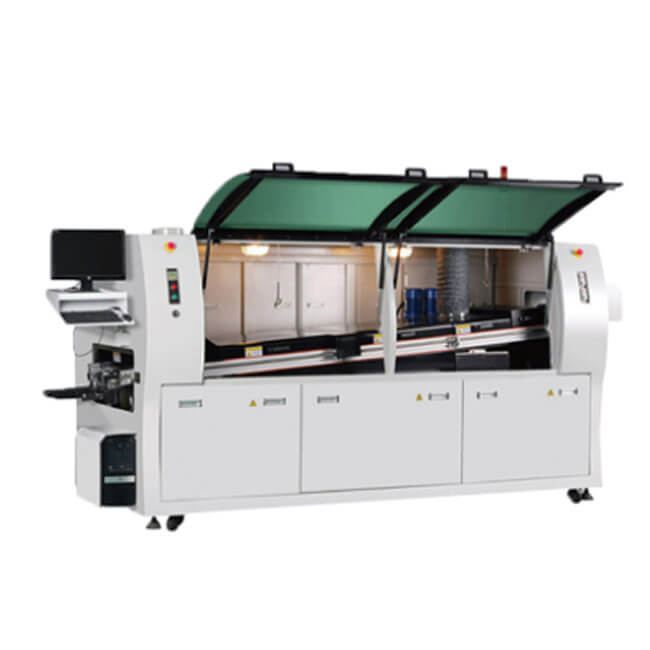 The wave soldering machine is mainly composed of transport belt, flux adding area, preheating area and tin furnace.