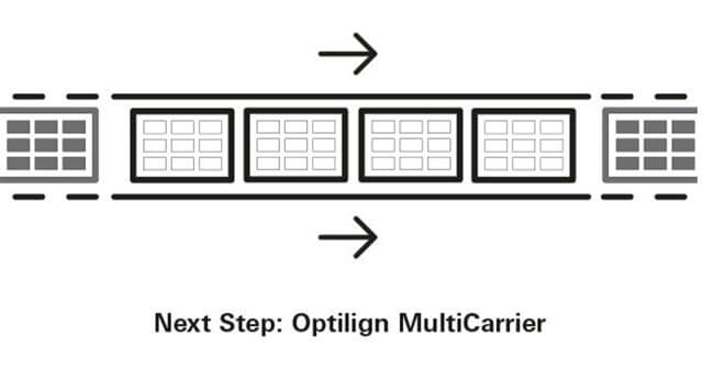 With Optilign MultiCarrier, this is now possible for several product carriers simultaneously. The printing machine collects up to six carriers, which are transported together into the process area. Each substrate is then individually aligned and then all carriers are printed simultaneously in one step. Afterwards the carriers are transported together into the outfeed. The outfeed passes the carriers on again individually to the next production station. Instead of using large and therefore expensive individual carriers, Optilign MultiCarrier uses several small product carriers. This increases the cost efficiency of the entire production process. Instead of product carriers, Optilign MultiCarrier can also directly process up to six PCBs with a total length of up to 510mm.
