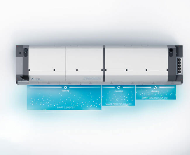 HOTFLOW THREE: the best reflow performance in every respect: Quality. Efficiency. Flexibility. Connectivity. Cleaning. It runs and runs and runs and sets the benchmark for reflow soldering with 12 weeks and more of non-stop operation without maintenance intervals. This is made possible by the patented three-stage Ersa SMART CLEANING system consisting of the new SMART ELEMENTS® filter system, the SMART PYROLYSIS CLEANER in the peak zone and the SMART CONDENSATION UNIT in the cooling zone.