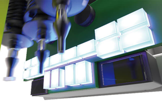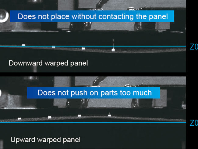 Reliable placement is ensured by detecting and compensating for panel warpage and variations in individual parts using advanced features. This maintains productivity, even with large panels that are prone to significant warping (up to 7 mm).