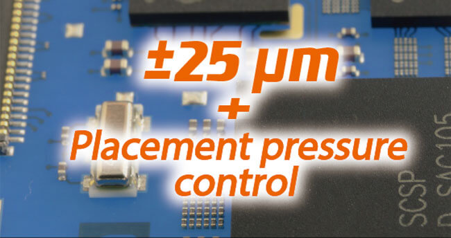 Placements are made with a high accuracy of ±25 µm, regardless of the head type or part being placed. It also carefully regulates the push-in pressure during placement to ensure optimal precision and reliability.