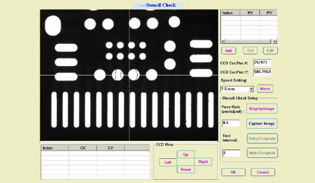Using panel light installed at the top and CCD camera below to inspect stencil apertures. It automatically detects the clogging of stencil apertures to eliminate poor quality stencil being used, ensure quality printing right from the start.