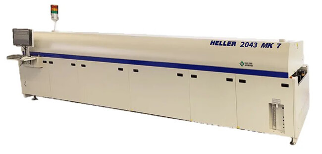 The 2043 MK7 reflow oven machine is an ultra-high volume reflow oven with 13 heated zones and belt speeds up to 1.88m/min. The 2043 offers the lowest delta T’s, reduced nitrogen and electrical consumption and advanced flux management options. The 12” wide heater modules offer profile compatibility with competitor systems.