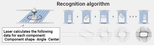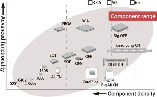 Various component shape can be recognized, such as SOP, QFP, BGA from 03015 minimal component to □50mm. Laser recognition realizes stable recognition and mounting without being affected by component variations such as electrode-shape and gloss.