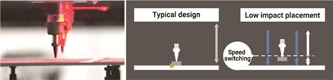 Low impact feature allows separately adjusting the down and up speed of the nozzle during placement. This minimizes the load on the part and on the board during placement. This is optimal for placing very small parts that require a lot of accuracy.