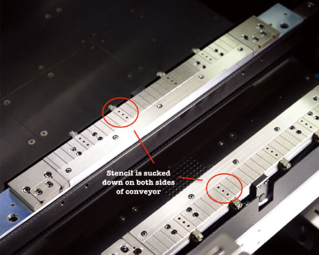 The Stencil lock sucks the stencil firmly on both sides of the conveyor during printing cycle. To eliminate stencil vibration by having firm contact with PCB. The PCB clamper is a combination of retractable top clamp and motor controlled side clamp, uniquely designed by GKG (patented). With these standard features, all of today’ s available and challenging substrates can be securely clamped and print to the highest quality.