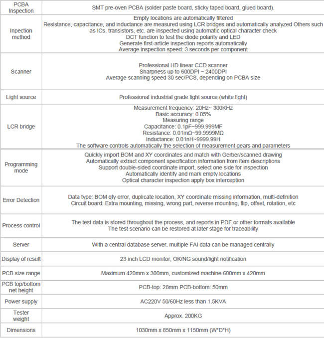 PMP-500 First Article Inspection Tester is mainly used for the first article inspection of the SMT production process in electronics factories. The operation of the tester for the first unit of PCBA inspection includes integrating the BOM, XY coordinates and Gerber/HD graphic to generate the program automatically,fast and accurate component inspection,automatic analysis, and generating a first-article inspection report. This will increase production efficiency and production capacity while enhancing quality control.