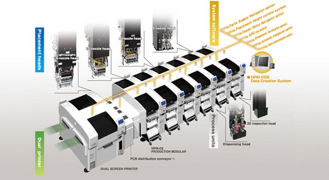 Panasonic NPM-D3 Electronic Production Modular is a new concept machine designed and manufactured by Panasonic according to electronic mounting changes. It integrated higher productivity and quality with printing, placement and inspection process. Configurable modules allow flexible line setup. Comprehensive control of electronics production lines, floor and factory with system software. It is the best choice for customers who require high production capacity, fast line transfer and wide variety of components.