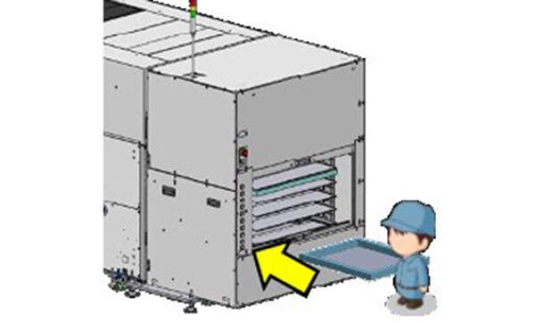 Automatic storing of the mask after the end of production in a magazine at the rear of the machine, and placement of another mask to be used for the next production model in the machine. Capable of stocking up to 10 masks in the magazine and taking masks in and out during production.