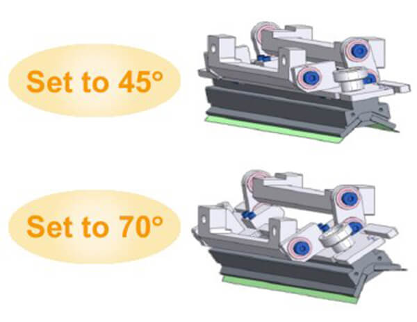The set squeegee angle can be adjusted, using the front and rear squeegee vertical axes, between 45° and 70° in 1 degree increments.