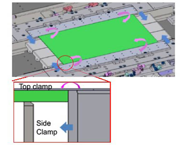 Pressing down on PCB edge faces increases screen printing quality of warped PCB.