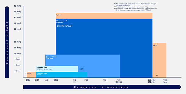 High load placement of 100N is able to eliminate pin floating, and tall component mounting up to 53mm (including PCB thickness) allows automated DIMM connector placement. (*Please consult us for applicable components.)