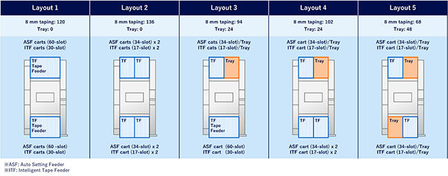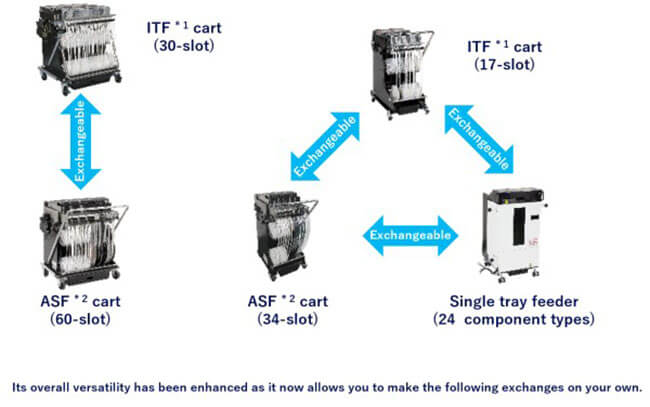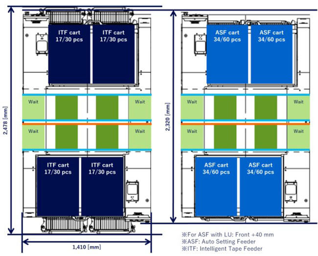 The basic performance of this modular mounter has been improved by renewing the core units, such as the placement head and recognition camera. It now supports a wide range of components and various components supply configurations, and can also handle larger PCBs. It also supports various automation and manpower-saving functions, including the Auto Setting Feeder (ASF), which automates the components supply operation, to flexibly meet the requirements of each mounting site.