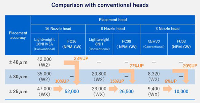 Flexible head configuration for 0201 to large and tall components. Production can be performed with high productivity. When compared with the catalog speed (CPH), the NPM-GW is approximately 10% better than our conventional model NPM-WX at ±25μm condition.