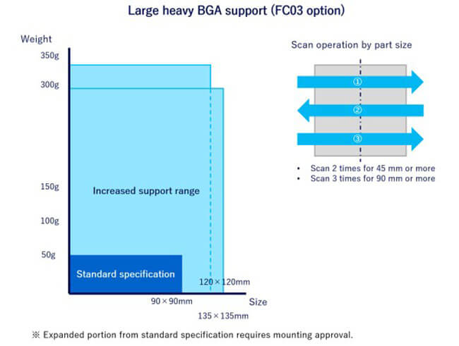 The nozzle is designed for large, heavy components, and scanning operations are tailored to the component size. And 15,000 BGA balls are detected, a trend in the server industry.