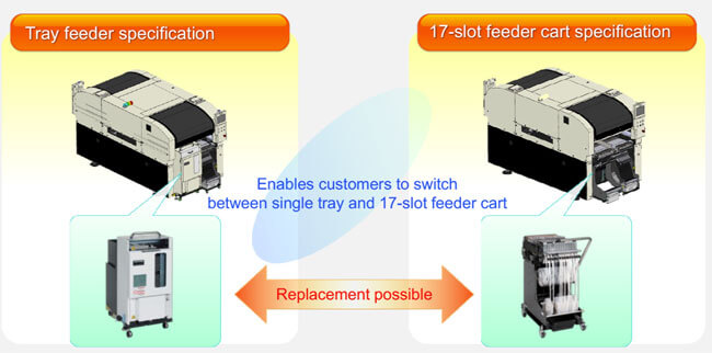 High-speed and highly efficient placement of odd-form components is achieved by arranging the tray feeders at front/rear, thus contributing to total productivity improvement