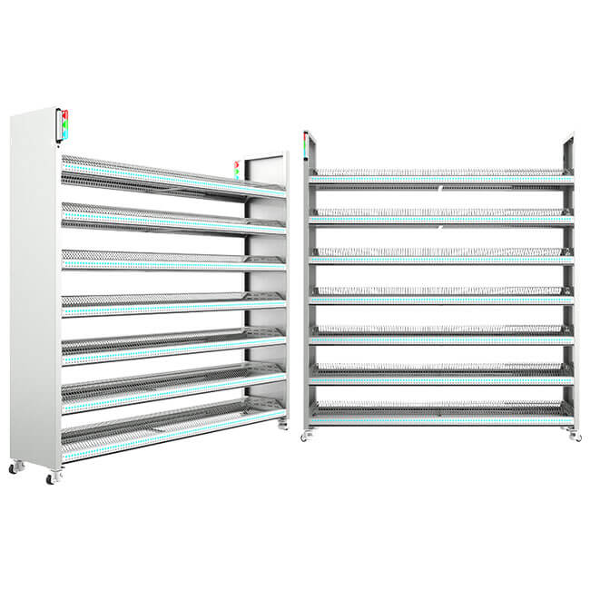 The SMD Smart Reel Rack is a cost-effective, manual storage solution designed for small enterprises with limited budgets. While it lacks automation, the rack uses sensors to detect reel placement, ensuring real-time inventory updates. The system supports one-to-one mapping of materials to storage locations, reducing human error in material retrieval. This practical approach offers efficient storage and retrieval while maintaining accuracy, making it an ideal choice for businesses seeking reliable yet affordable material management.