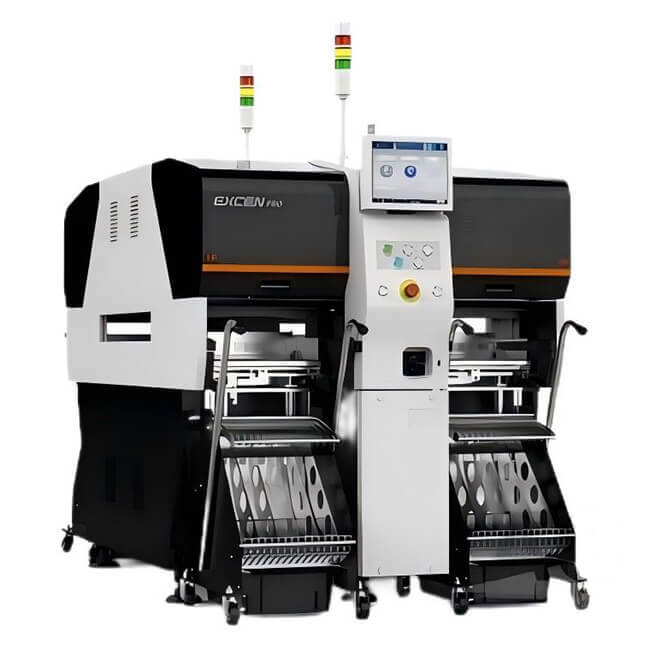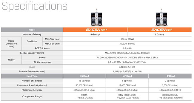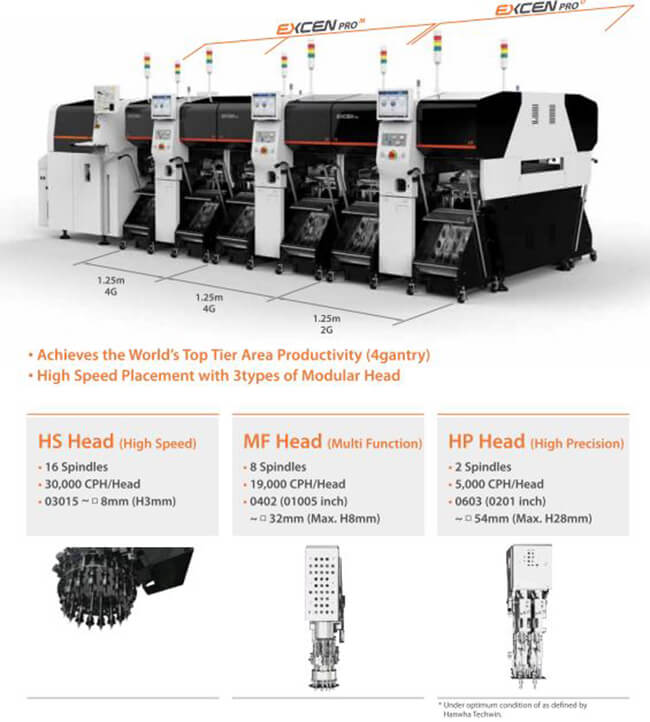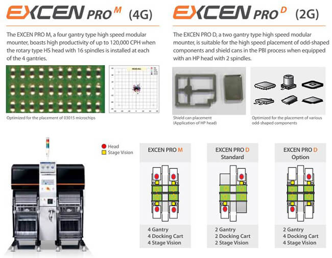 A high speed modular mounter using a high speed rotary head equipped with 16 nozzles. EXCEN has the world’s highest speed in the world among mounters of the same class as well as the world’s highest area productivity. In addition, it secures the reliability of fine chip placement by using the function to monitor pre- and post-part placement, SVS (Side-view Vision System), and maximizes work convenience and actual productivity by applying various operation modes including non-stop device type change,mixed production of different boards as well as the SMART Feeder that realizes the world’s first Auto Splicing and Auto Loading functions.